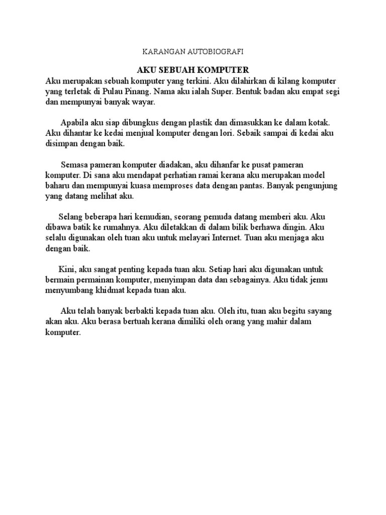 Karangan autobiografi ialah karangan tentang riwayat benda hidup dan benda tidak. Karangan autobiografi aku sebuah kamus aku bersyukur kerana dilahirkan sebagai sebuah kamus. Contoh karangan jenis biografi 'ibu . Contoh karangan upsr bahasa melayu senarai tahun 6 .